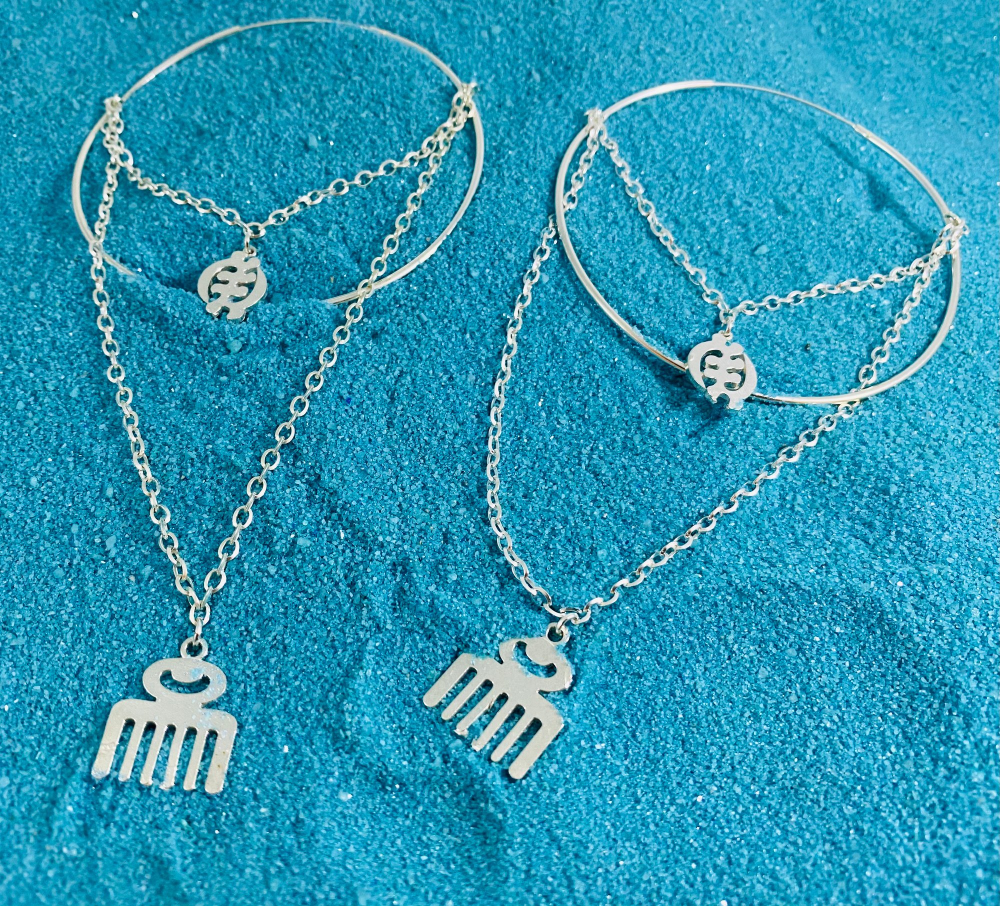 - Pair of hoops: Medium, Large, Extra Large - Width: 3mm (thickness) - Drop chains - 1 Duafe (meaning: beauty) and 1 Gye Nyame (meaning: fear none, but God) charm per hoop - Metal: 925 Sterling Silver