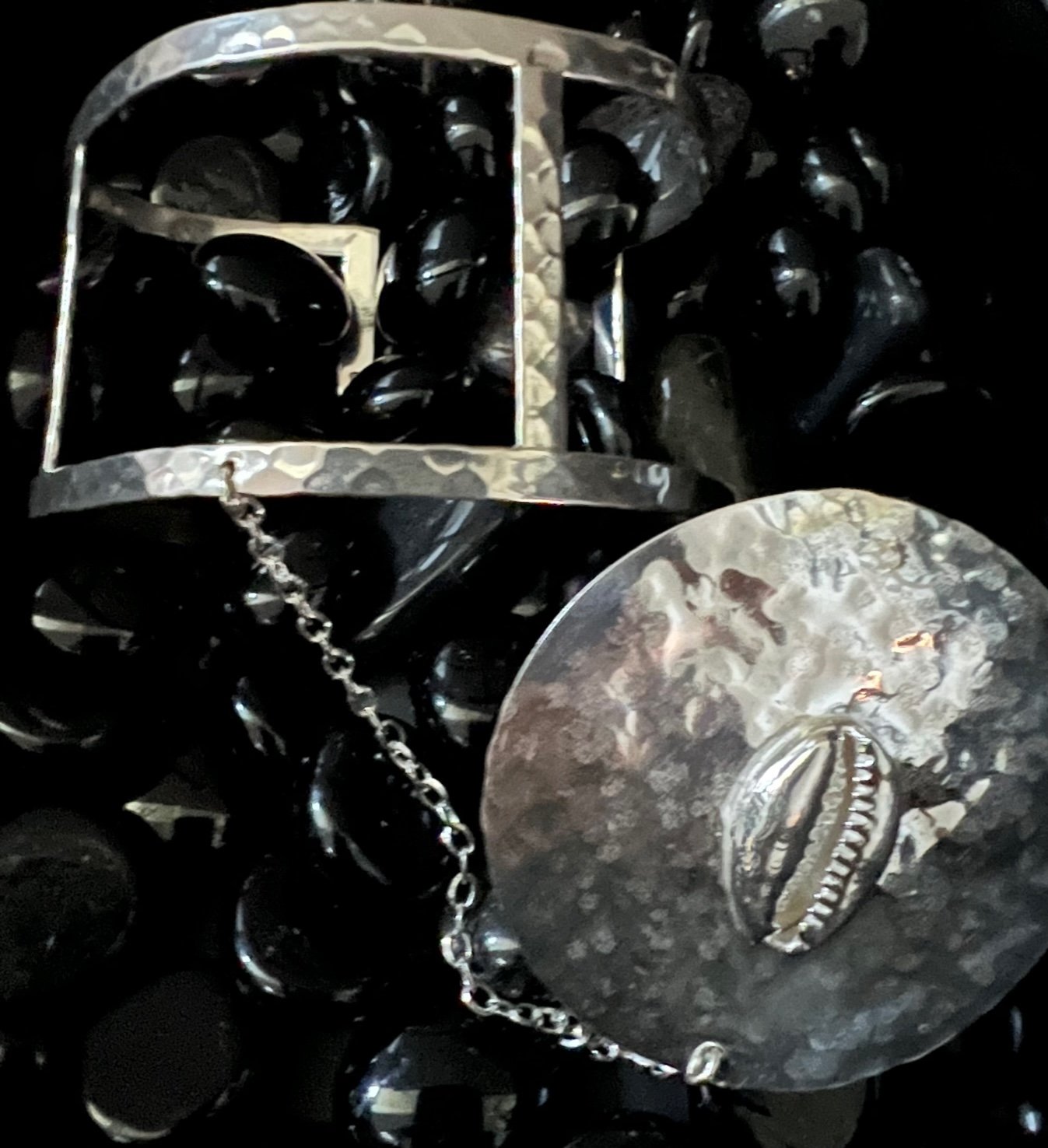 Adjustable cuff w/ chain, and adjustable circular hammered adjustable ring w/ cowrie shell.