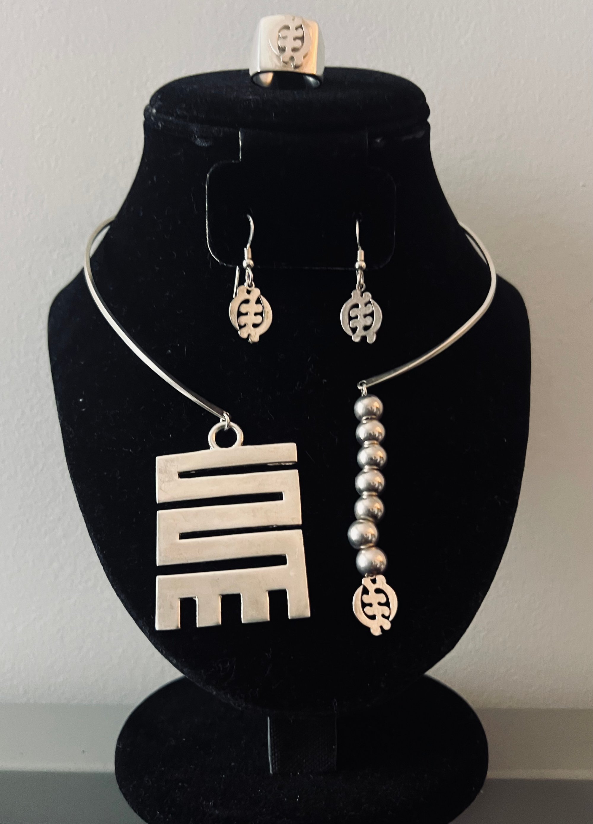 - Split collar/neck ring w/ 1 Nkyinkyim, large (meaning: twisted or versatility) pendant and 1 small Gye Nyame